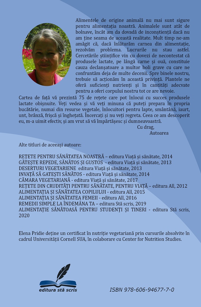 Cartea de față vă prezintă 75 de rețete care pot înlocui cu succes produsele lactate obișnuite. Veți vedea și vă veți minuna că puteți prepara în propria bucătărie, numai din resurse vegetale, înlocuitori pentru lapte, smântână, iaurt, unt, brânză, frișcă și înghețată. Încercați și nu veți regreta. Ceea ce am descoperit eu, m-a uimit efectiv, și am vrut să vă împărtășesc și dumneavoastră.